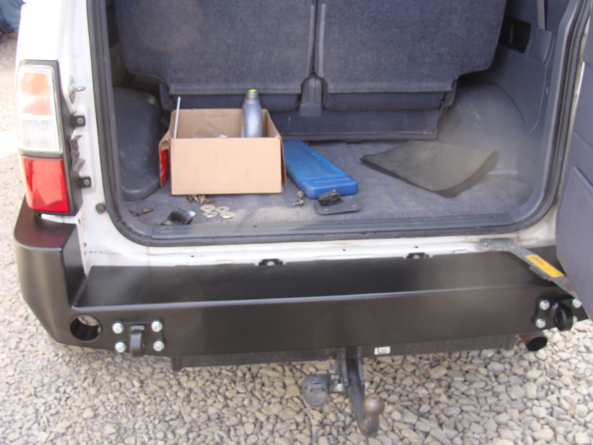 Nowy zderzak tylny do samochodu Toyota LC 90 wykonany z blachy grubości 4mm mocowania do ramy grubości 5mm posiada otwory do podnośnika hi-lift oraz otwory mocowań uchwytów szekli mocowania szekli widoczne na zdjęciu nie są zawarte w cenie zderzaka. Zderzak cięty laserowo gięty na prasie krawędziowej śrutowany, cynkowany, lakierowany proszkowo. Zderzak nie posiada homologacji